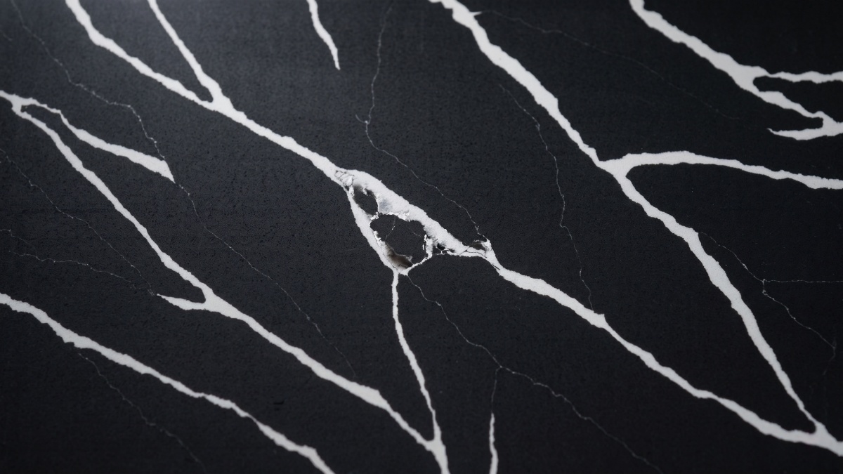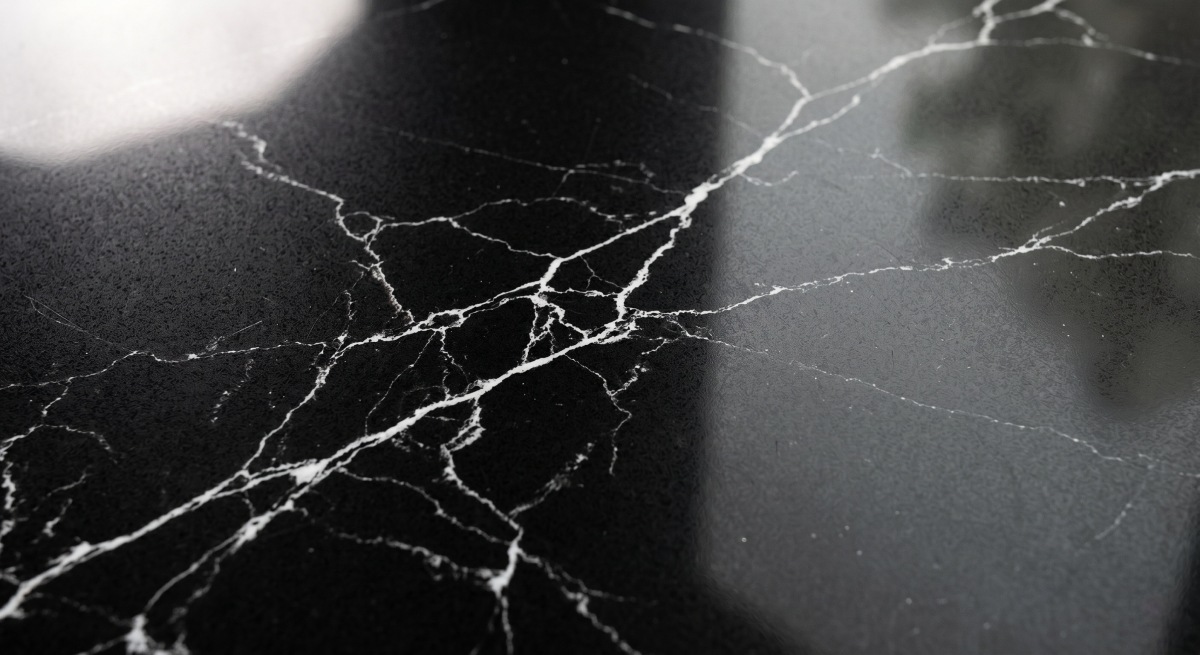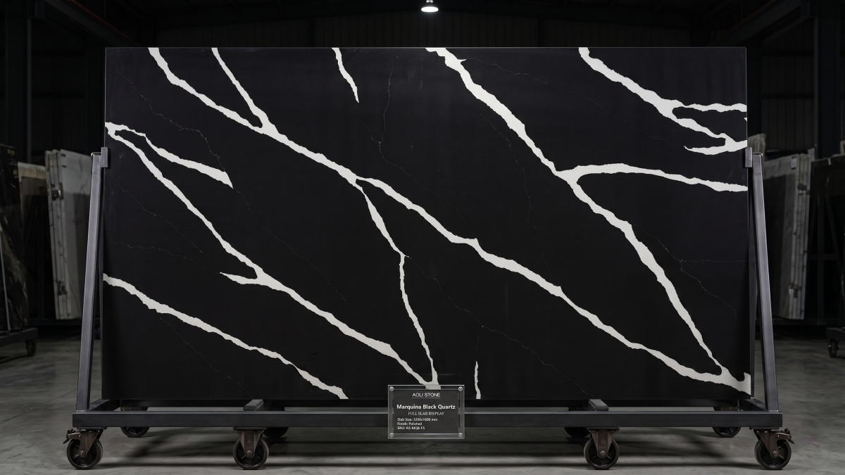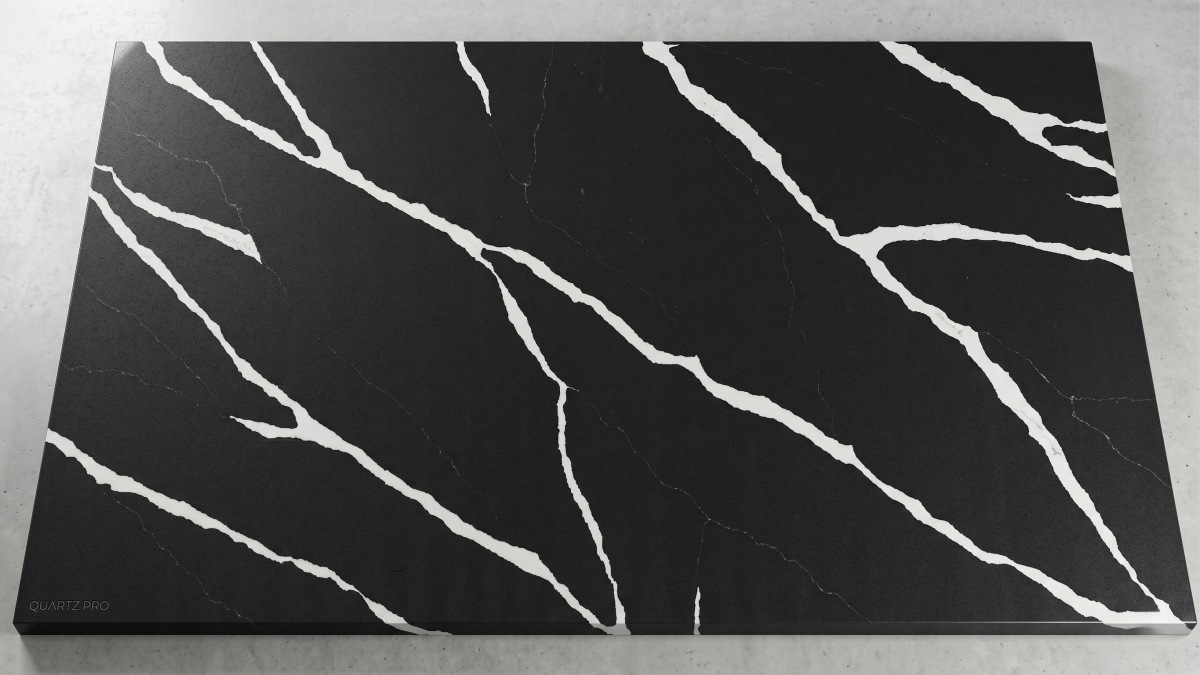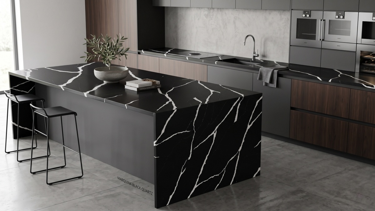 Marquina Black Quartz is a deep black quartz surface defined by broad white veining and strong directional movement. It is made for interiors where the stone is expected to carry visual weight rather than quietly disappear into the background. For buyers who want a sharper black-and-white architectural look, this design is easier to position than softer grey-black alternatives.