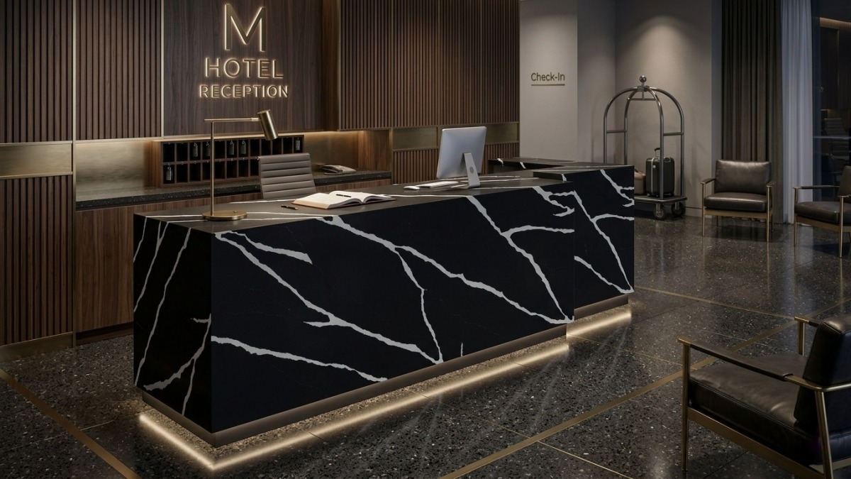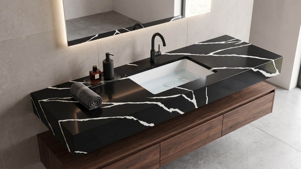 Marquina Black Quartz features a deep black base with bold white diagonal veining, designed for statement countertops, vanity tops, reception desks, and contemporary interior surfaces.