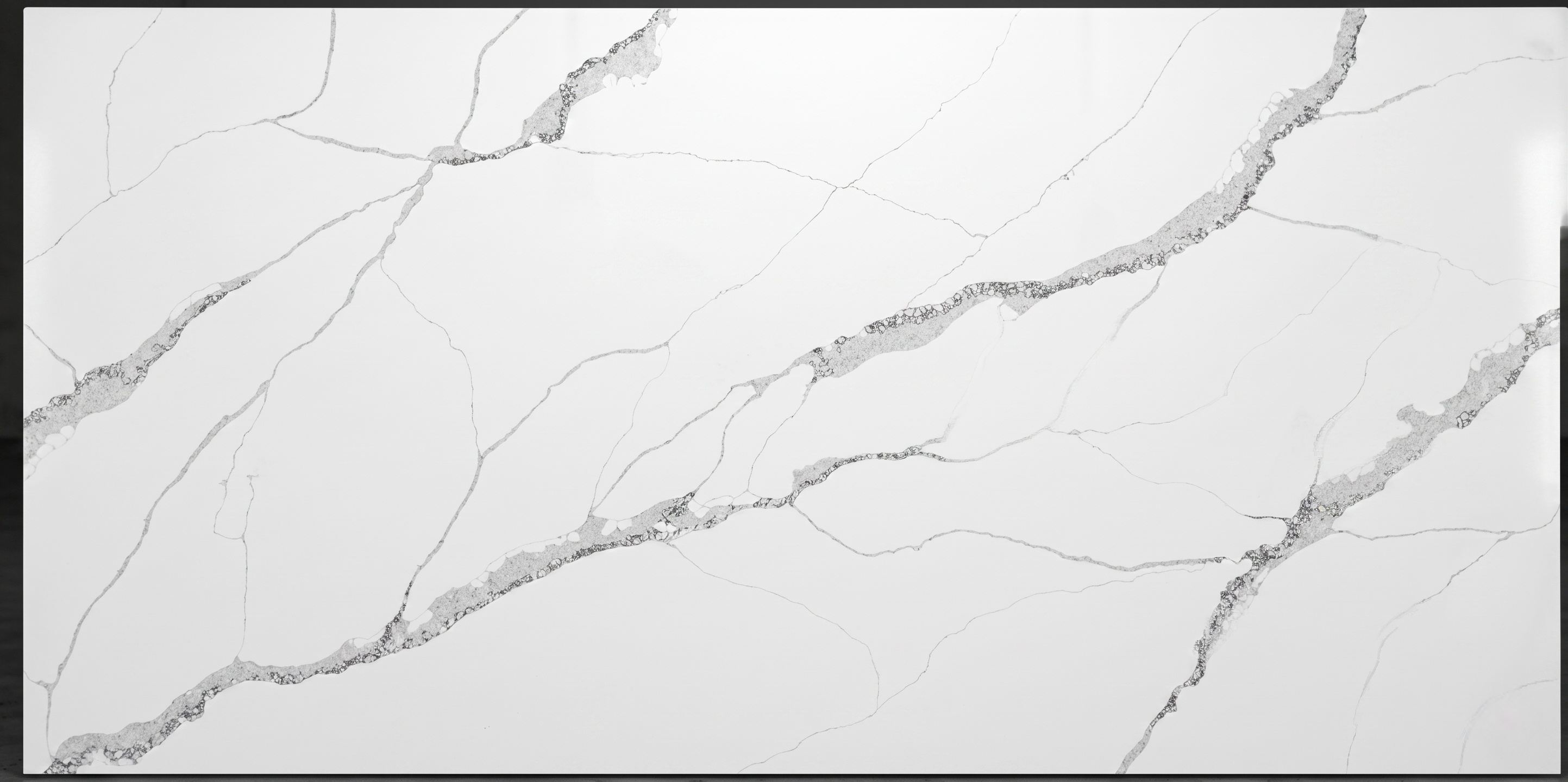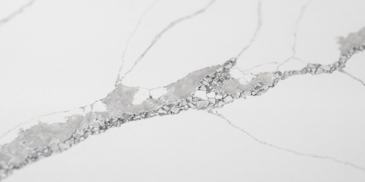 Silver Reef Quartz is created for buyers who want a white quartz surface with more depth than a plain slab and more control than an overly bold marble-look pattern. Its visual character comes from broad silver-grey veins that move diagonally across the slab, combined with fine secondary lines and softly fragmented mineral-style borders.