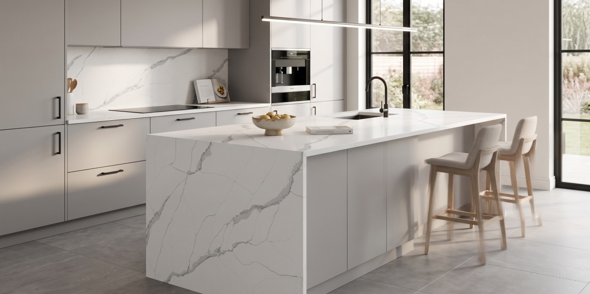 Best for indoor surfaces where a bright white base and layered grey movement are preferred, especially in kitchens, islands, vanity areas, and modern project interiors.