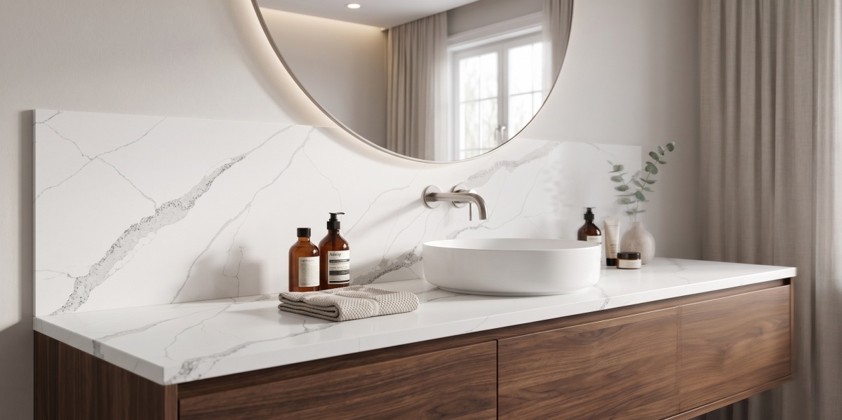 Kitchen countertops, waterfall islands, bathroom vanity tops, backsplashes, reception counters, apartment interiors, villas, hotel spaces, and other modern interior applications.